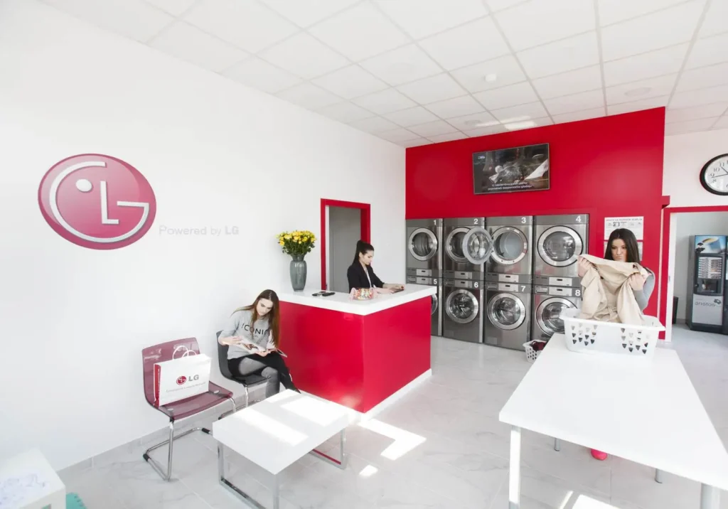Przyjemna atmosfera. LG Laundry Lounge stara się wprowadzić “domową atmosferę” w pralni. Wystrój wnętrz i perfekcyjna czystość tworzą przyjemną atmosferę. Dodatkowo klienci mają bezpłatny internet, dostęp do telewizji, ekspresu do kawy, napojów i przekąsek oraz kącika dla dzieci – wszyscy mogą czuć się jak “w domu”. Podczas oczekiwania klienci mogą ładować swoje tablety i smartfony. Dostępne są również tablety do bezpłatniego użytku klientów pralni. Miła atmosfera zachęca do miłych rozmów.