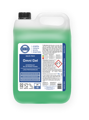 Profesjonalny żel Omni Gel przeznaczony jest do prania tkanin białych i kolorowych. Może on być użytkowany we wszystkich typach pralek oraz w praniu ręcznym. Żel posiada podwyższone właściwości odtłuszczające, zawiera również substancje odplamiające. Zapobiega szarzeniu tkanin, dzięki czemu opóźnia proces ich starzenia. Działa w niskich temperaturach oraz zapewnia uczucie świeżości. Łączy moc usuwania zabrudzeń i delikatność dla tkanin.